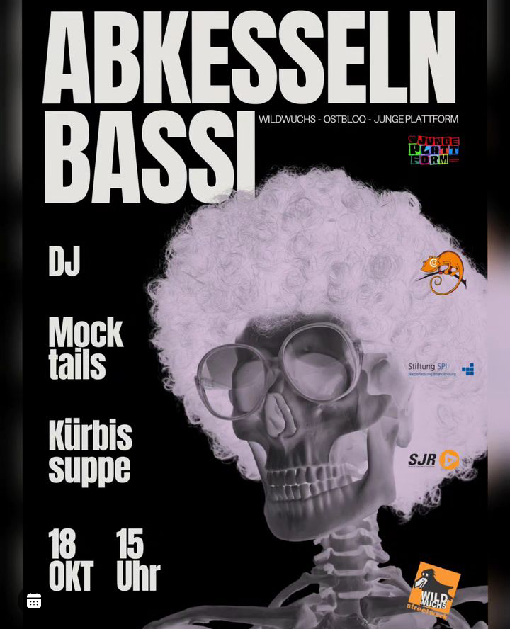 Mit DJs, alkoholfreien Drinks und Food feiern wir gemeinsam mit dem Wildwuchs Streetwork und dem Jugendclub Ostbloq vom Chill Out e.V. unser letztes, gemeinsames Open Air. Von 15-19 Uhr sind wir da und freuen uns darauf mit euch zu quatschen, chillen und vielleicht auch ein wenig zu dancen:)