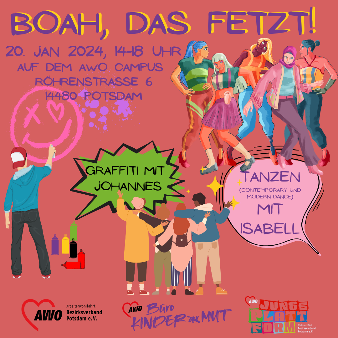 ***Boah, das fetzt!*** In kleiner, gemütlicher Runde sind wir am 20.01. ins neue Veranstaltungsjahr gestartet. Mit Johannes konnte die neue Graffitifläche eingeweiht und mit Isabell coole Tanzmooves ausprobiert werden. Im Anschluss haben wir zusammen vegane Pizzasuppe gegessen und den Nachmittag ausklingen lassen. Schön war's!